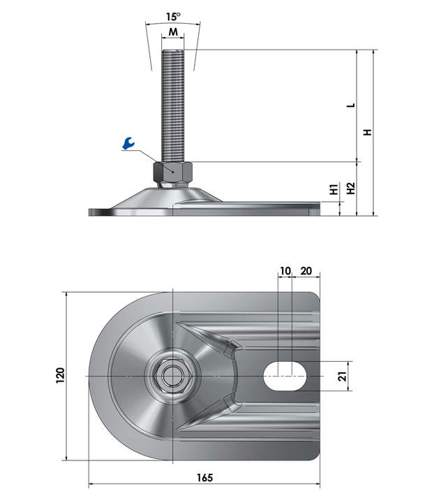 Las patas de nivelación sin mantenimiento son ajustables en altura de forma continua a través de la rosca (en función de la longitud del husillo) y pueden inclinarse hasta cierto punto, lo que facilita el montaje y la alineación.