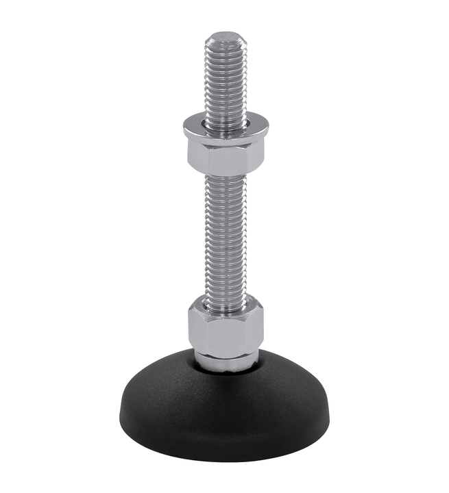 Der wartungsfreie Maschinenfuß KF60 ist stufenlos über das Gewinde höhenverstellbar (je nach Spindellänge) und bis zu einem gewissen Grad neigbar, was die präzise Montage und Ausrichtung vereinfacht.