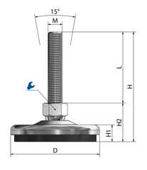 Der Maschinenfuss ist stufenlos über das Gewinde höhenverstellbar (je nach Spindellänge) und über die kugelgelagerte Spindel in einem Neigungswinkel von ca. 7,5° in jede Richtung (ca. 15° gesamt) einstellbar. Dies garantiert eine stabile und genaue Ausrichtung der Maschine.