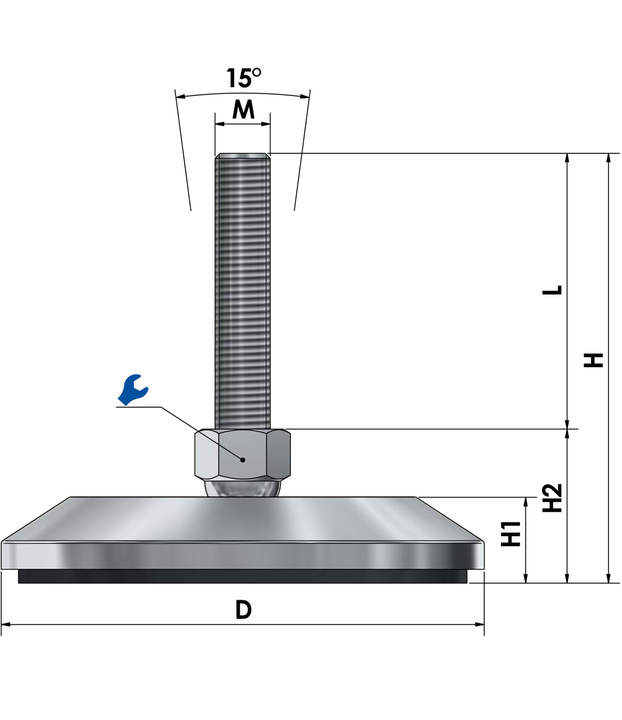 Der Maschinenfuss ist stufenlos über das Gewinde höhenverstellbar (je nach Spindellänge) und über die kugelgelagerte Spindel in einem Neigungswinkel von ca. 7,5° in jede Richtung (ca. 15° gesamt) einstellbar. Dies garantiert eine stabile und genaue Ausrichtung der Maschine.